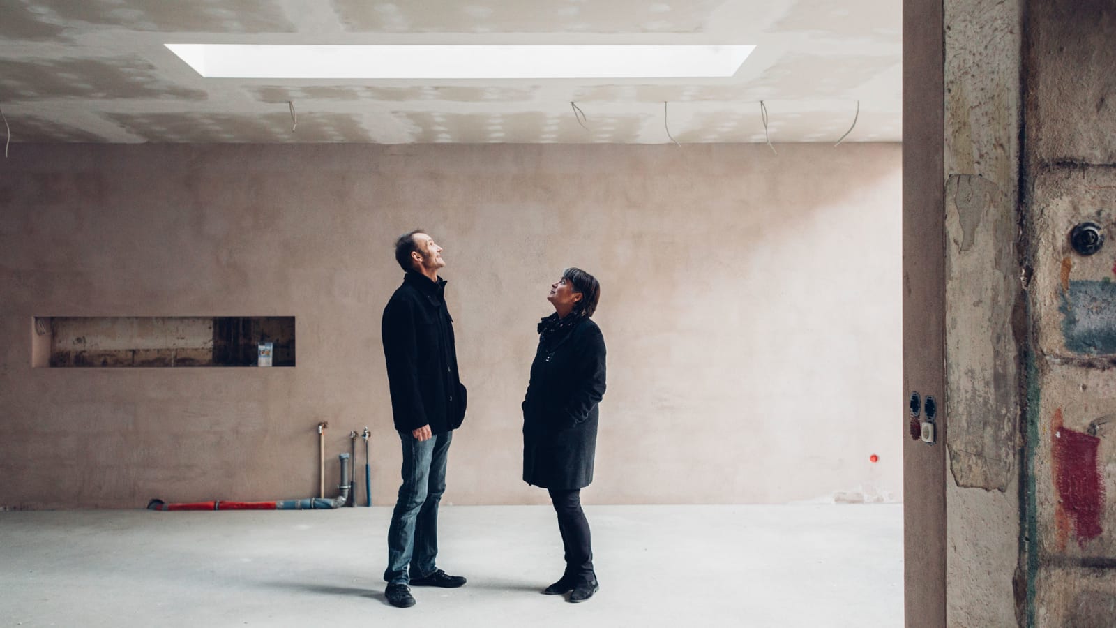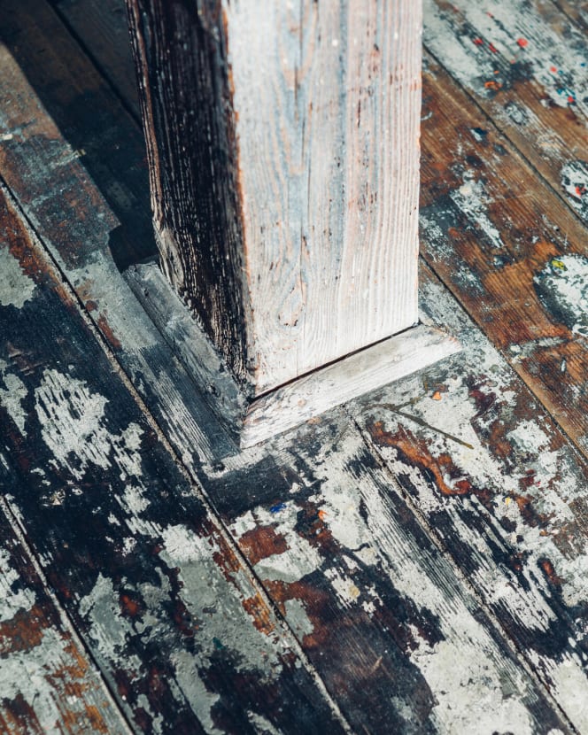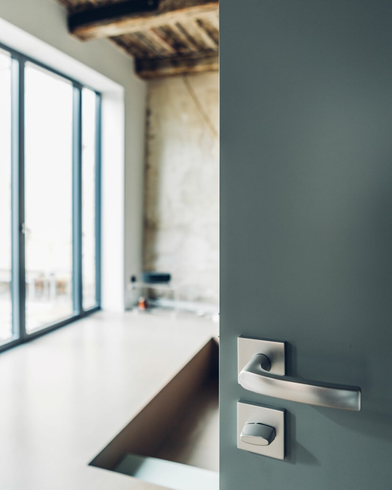 One former workshop room revealed paint layers centimeters thick, coating floors and walls from decades of brushes being struck and rollers unloaded. For the architects, it became an aesthetic and symbolic artifact, one worth preserving. All existing elements were left rough, visibly aged. All new additions were clean, angular, minimalist, flush.