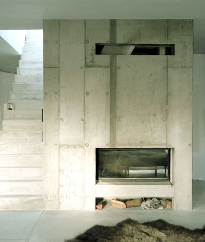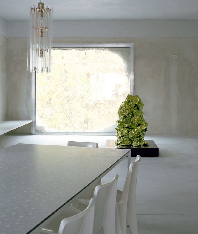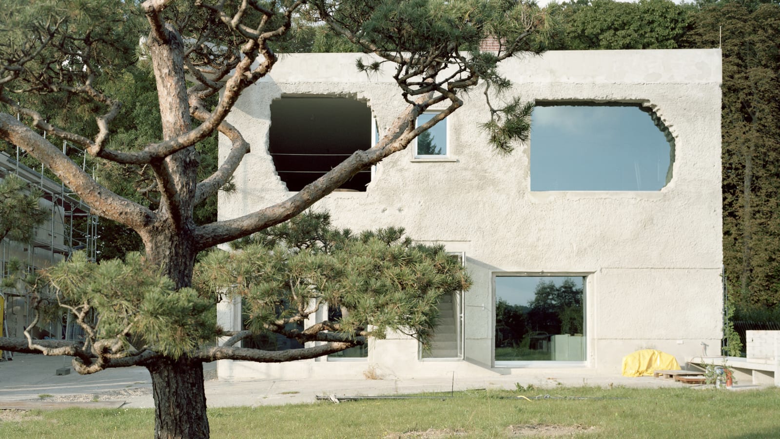 The building’s four massive window openings—framing views of forest and lake—were created during a communal event: friends were invited to break through the walls using sledgehammers. The jagged edges of the openings remain untouched, their rawness preserved under large glass panes. These expressive scars keep the memory of their making alive.