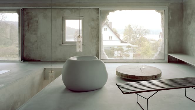 All handles are made of untreated aluminum, which weathers over time to a pale matte gray. The patina integrates naturally into the space, harmonizing with the raw concrete, gray-lacquered doors, and aluminum window frames. In the Antivilla, everything converges into one vast, playable gray—fluid, open, and unpretentious.