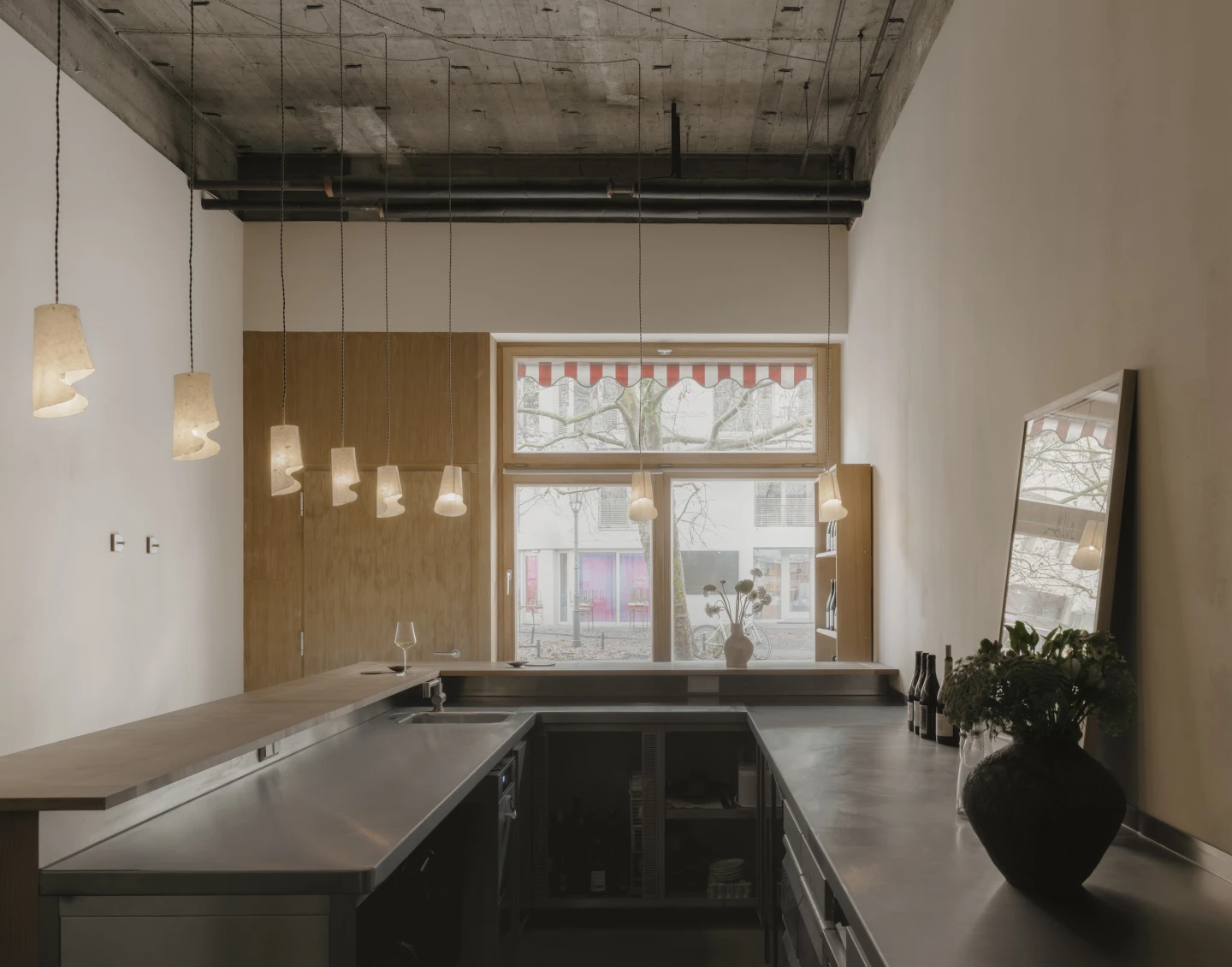 ernst cave is located on the ground floor and in the basement of a post-war building that formerly housed a bowling alley. Most of the existing interior was dismantled, exposing the raw ceiling and old pipework. The bar, representing the jewel inside a rough shell, is made of German cherry wood of a particularly rare quality and encased in zinc sheeting that will oxidize over time in response to being touched. Just a few days after a bare knee touches the zinc in summertime, for example, an imprint will form. The lampshades above the bar are made of three-ply Nepalese paper from the bark of a tree.