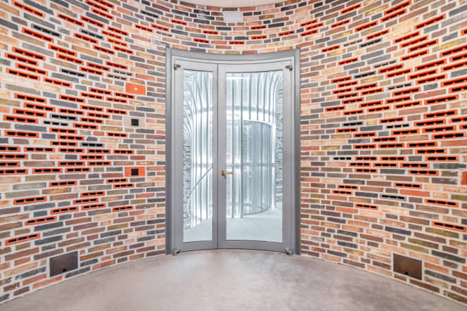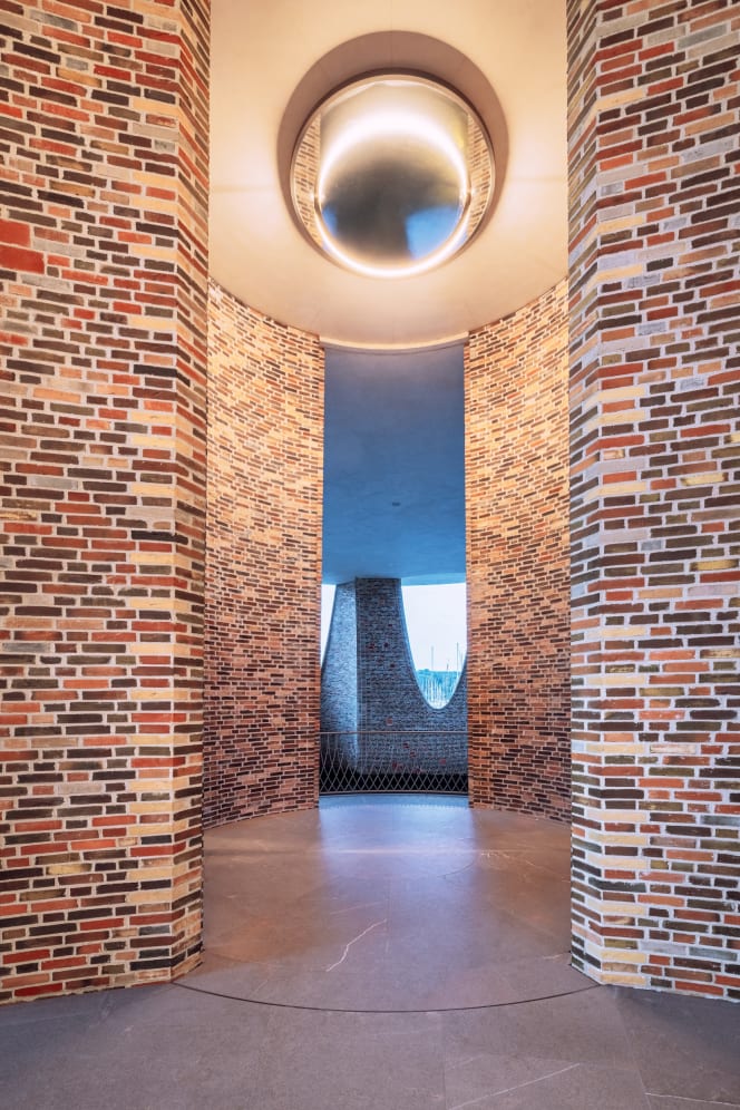 Built entirely of custom-made bricks in varied hues, the structure appears in motion, as if shaped by the sea itself. Circular and elliptical apertures pierce the façade, their forms echoed in the interiors and furnishings. The project’s commitment to natural materials and environmental resonance is felt in every detail, from the light reflections to the quality of the air and acoustics.
