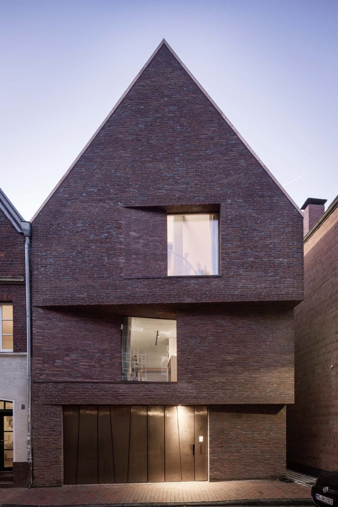 Built on a narrow urban plot, the house rises four stories behind a steeply pitched roof. Its proportions and alignment continue the rhythm of the street, while its sharply cut silhouette gives it a sculptural quality. The façade is clad in handmade clinker brick, a material deeply embedded in the architectural heritage of Westphalia. Window openings are precisely placed—recessed, framed, and sized to modulate light and privacy.