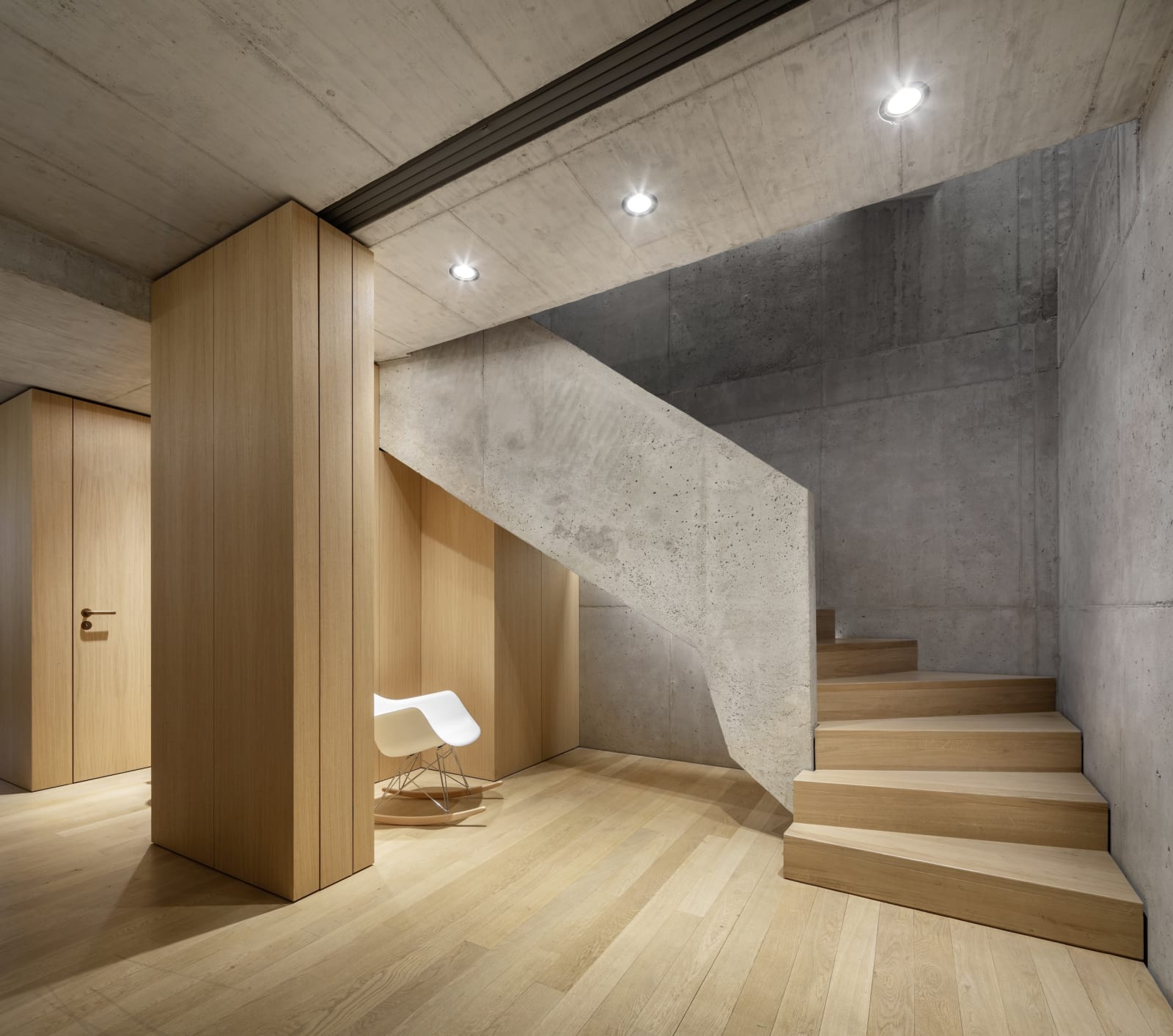 Inside, the house is organized across split levels, maximizing spatial flow within a compact footprint. The material palette is reduced, but rich in texture: polished screed, raw oak, plastered brick, and exposed concrete. The interplay of daylight and materiality lends warmth and intimacy to every room.