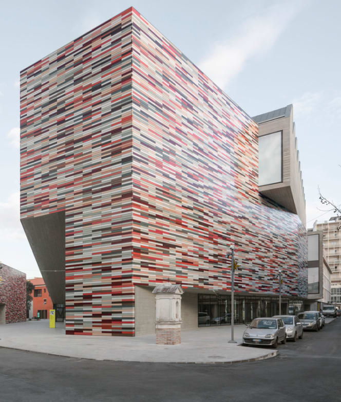 Located just steps from Mestre’s main square, the M9 Museum sits within a former convent complex. Sauerbruch Hutton’s intervention carefully integrates new and historic elements, preserving the site’s identity while injecting contemporary energy. The museum itself occupies a dynamic volume of interlocking angular forms, clad in glazed ceramic tiles in red, white, and gray—a nod to Venetian tradition, reinterpreted through modern craft.