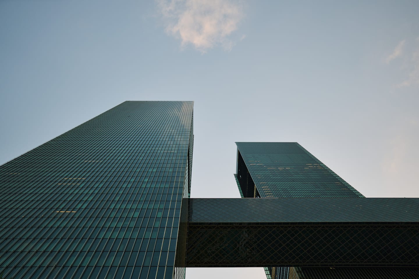 The façade is composed of large-scale, floor-spanning glazing set into vertical aluminum profiles. These curtain-wall elements are articulated with faceted angles, giving the tower a crystalline presence. Depending on the time of day, the surface alternates between transparency and reflection—projecting the city back onto itself.