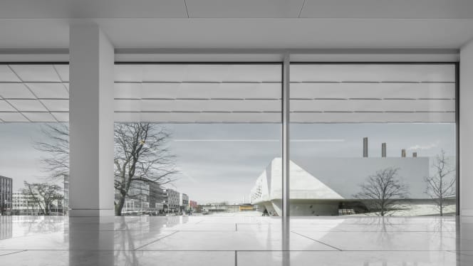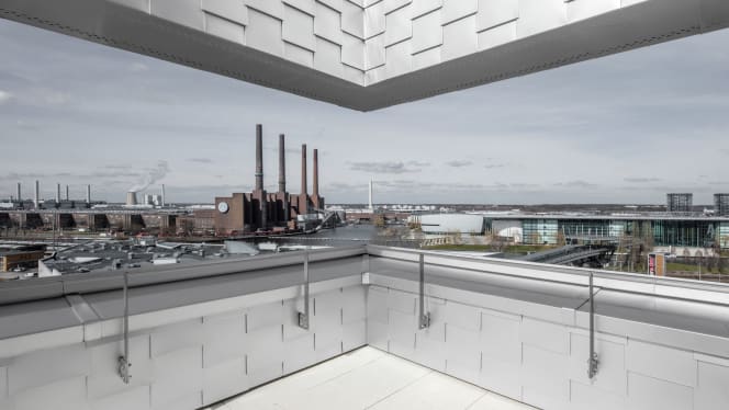 The interior continues the architectural precision of the exterior: clear lines, robust materials, and restrained colors define the common areas. Circulation cores are placed efficiently to allow flexible layouts on the office floors. On the upper levels, a hotel and sky bar offer panoramic views over Wolfsburg and the surrounding landscape.