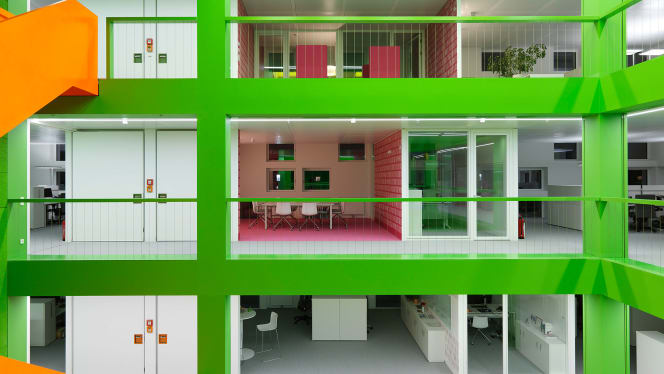 The upper floors host open offices, interrupted only by three enclosed workspaces. From above, the building reveals its rhythmic layout: irregular window perforations and staggered horizontal bands frame the green conference center and red showroom below.