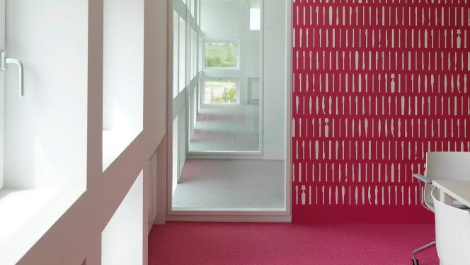Throughout, the building merges architecture with brand identity. Even the custom wallpaper features stylized forms from STABILO’s product range. A feng shui consultant advised the architects on spatial and chromatic balance. White surfaces calm the vivid palette, while gray floors and light-filled work zones enhance usability.